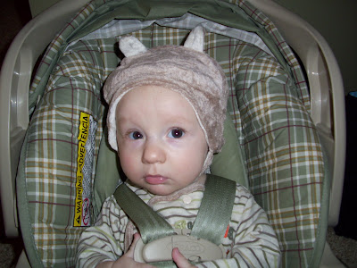 His first time in the exersaucer- he's a little small for it, but loved staring at all of the toys!